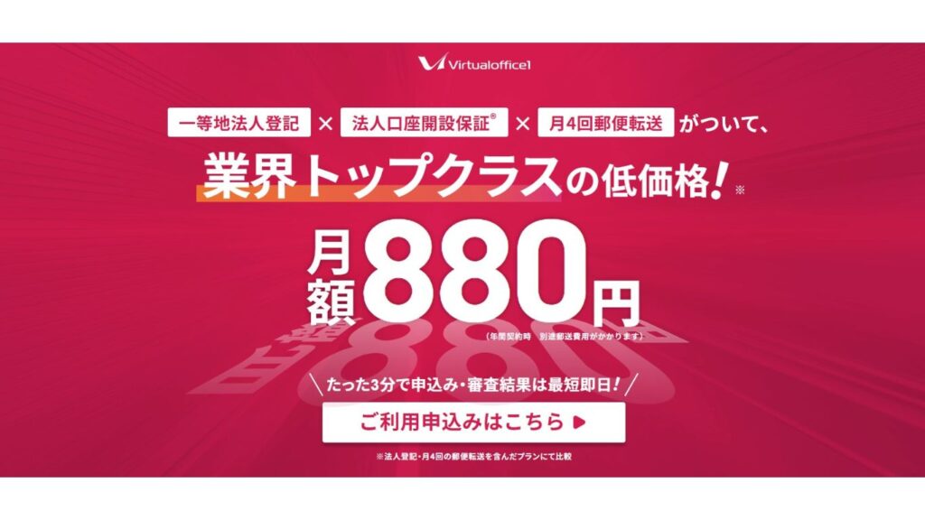 | バーチャルオフィス1 | 入会金:5,500円 | 月額880円~ | あり(週1回) | 可 |