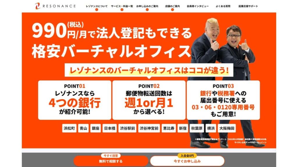 レゾナンスは、東京都心・横浜・大阪などの一等地住所を月額990円〜利用できるバーチャルオフィスサービスです。法人登記に対応しており、コストを抑えながら信頼性のあるビジネス住所を持ちたい個人事業主・フリーランス・スタートアップ企業に適しています。